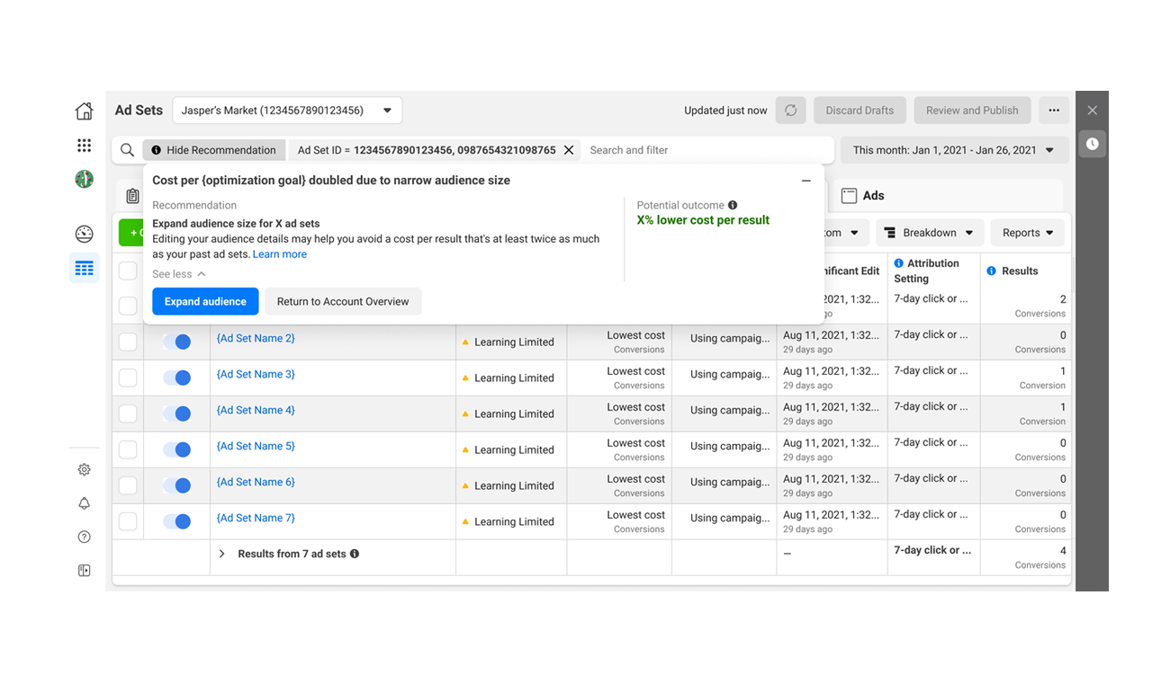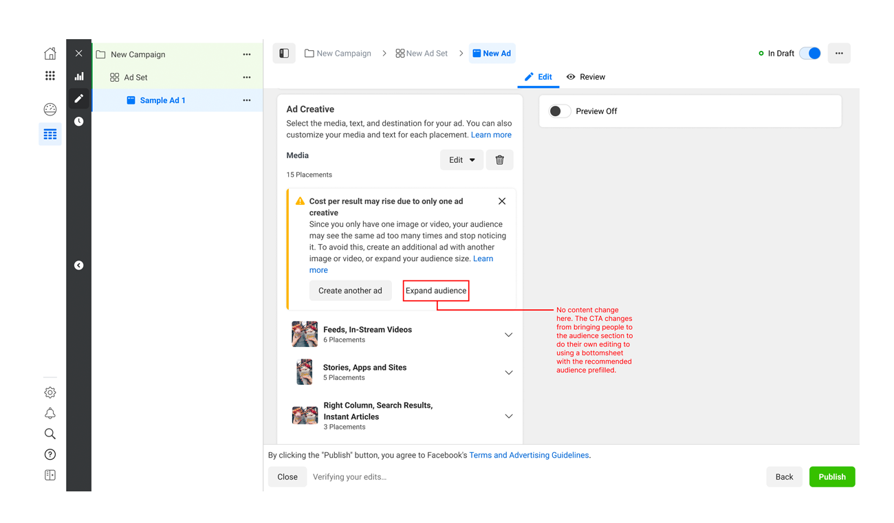 I was the senior designer for Ads Audience Expansion, a workflow that uses machine learning to assess and suggest optimizations across ad campaigns.